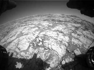 Curiosity continues her traverse across the lowermost portions of Vera Rubin Ridge, where she continues to investigate the interesting rock textures and colors ahead. Our current location is quite dusty, which motivated the science team to focus on a relatively quick characterization of the surrounding bedrock, which will allow the rover to drive away and continue making progress towards some of the other interesting locations within Vera Rubin Ridge. The upcoming plan involves a quick "touch-and-go" using the APXS and MAHLI instruments for the chemical and morphological investigation (respectively) of a flat piece of bedrock named "Sherwood Forest." After stowing her arm, Curiosity will then use Mastcam and ChemCam to analyze both "Sherwood Forest" and a dark-toned target named "Tableland." These targets are located just to the left of center in this front Hazcam image.