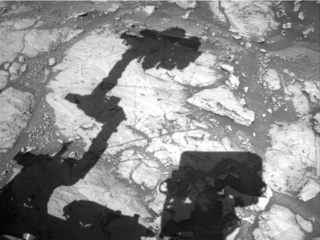 Above is a Navcam image of Curiosity's location after a successful drive on Sol 1869. The shadows show the Robotic Arm (RA) and turret on the left, and the Remote Sensing Mast (RSM) to the lower right. I can't help but think that Curiosity is giving us a "high-five" for another stellar drive!