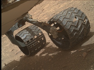 Curiosity drove a little over 16 m to the west this weekend. The rover is currently skirting around the southern edge of a small, blocky impact crater on its way north off the Vera Rubin Ridge. One of the activities we did this weekend was use MAHLI to take images of the rover wheels. We do this activity, dubbed Full MAHLI Wheel Imaging (or FMWI in NASA acronym speak), every few hundred meters to track damage to Curiosity's wheels caused by the terrain. It's important for us to take this observation in order to estimate how much farther the rover will be able to drive before the wheels become inoperable, and also to understand if the sharp edges of the broken wheels risk damaging the nearby cables. So far, we estimate we're in pretty great shape for our plans to drive a lot farther up Mt. Sharp!