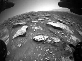 As Curiosity continues to descend the Vera Rubin Ridge, the science team is doing their best to characterize, for a second time, all of the structural, chemical, and spectral variations originally seen as we climbed up the ridge. Yesterday's drive brought Curiosity from the "Pettegrove Point" member of the VRR into the "Blunts Point" member, which is just below the ridge itself. So, the team was planning to spend a full day at this location to perform remote science investigations, to brush off a rock surface, to analyze the surface's chemistry with the APXS instrument, and to take some high-resolution oblique images to characterize the layering observed in the sides of the rocks. When the team woke up this morning and first saw the workspace in front of the rover, everyone was happy and eager to get to work!