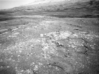 This Navcam image shows the outcrop of red Jura rock that the rover will image during the weekend drive. Obtaining higher resolution images of this exposure will help the team determine if it could be drilled next week.