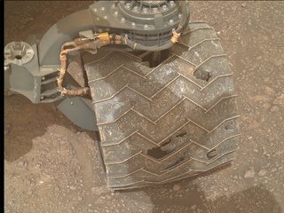 Our first move is a series of bumps that will scoot us forward 2 m as we image the wheels that will carry us to the clay-bearing unit and beyond. The process, called full MAHLI wheel imaging, involves poising MAHLI obliquely above the wheels to image them, stowing the arm, bumping forward a few tens of centimeters to bring the next segment of wheel into view, unstowing the arm, and imaging the wheels once again. It takes 4 small bumps to fully image the outer circumference of the wheels. The first set of wheel images was acquired by MAHLI on Sol 2291, one of which is featured above. Even with the bumps and tears visible in this image, the wheels are still capable of carrying us for many more kilometers across the clay-bearing unit and up Mount Sharp! As we bump forward to take the wheel images, we will also acquire a MARDI image at each stop, resulting in a tightly overlapping set of MARDI images that can be combined to create a digital elevation model of the terrain under the rover. The final stop will place the Rock Hall drill hole in the MARDI field of view, giving MARDI our last look at Rock Hall.