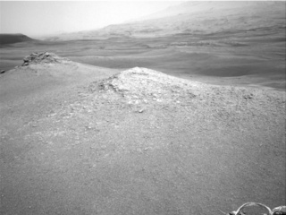 We're driving up to the crest of a ridge so that we will be able to see down the other side, which is currently hidden from our view. The new terrain is so featureless, that visual odometry is having trouble tracking our position and measuring slip, which caused the rover to stop the sol 2304 drive early. The image above (Sol 2304 post-drive Navcam) shows the ridge and the smooth terrain. The rover planners are using some extra imaging to help us characterize how the rover performs on this new terrain. We are hoping something of interest will be in our workspace for contact science in the weekend plan. Much of our post-drive imaging will also be of higher resolution than usual (lossless compression) so that we can see the fine details and get good stereo for drive planning.