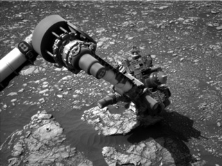 We got the go ahead at the start of planning to proceed with dumping the Kilmarie drill fines from the drill bit assembly. Both the SAM and CheMin instruments have completed or are nearing completion of analyses of the pulverized Kilmarie sample and it is now the turn of APXS and MAHLI to analyze the material. As a member of the APXS team and the strategic planner today for our instrument, I was excited to use APXS and to start analyzing the drill fines. We have been waiting patiently to use APXS and MAHLI, because any arm activity is precluded while sample is in the drill bit assembly. The chemical analysis of the dumped material by APXS and eventually ChemCam will be compared with that of the bedrock surface prior to drilling, as well as to the nearby "Aberlady" drill fines, to look for variations in composition with depth and between the two drill holes. Specifically, the APXS-derived chemistry of the dumped material will be used by the CheMin team to refine their mineralogical analysis. The close-up imaging by MAHLI will tell us about the texture and colour of the fines in detail and assist the APXS team in determining exactly where our instrument was placed. MAHLI will also image the drill hole and tailings (powdered rock material surrounding the drill hole) at a 25 cm standoff to assist placement of APXS and closer-up MAHLI imaging in the next plan. Mastcam multispectral imaging and ChemCam passive spectroscopy of the Kilmarie dumped material will aid in further elucidating mineralogy.