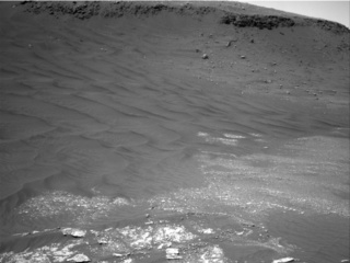 This Navcam image acquired on Sol 2412 shows a portion of the ripple field we explored over the weekend, as well as some of the rubbly material comprising the southern side of the Vera Rubin Ridge. This outcrop will be the target of a higher resolution Mastcam stereo mosaic planned today.