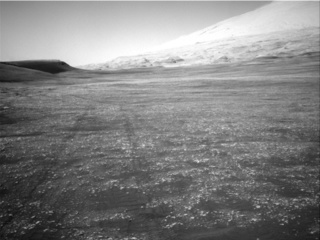 We've left multiple tracks across the cobblestone plain of Glen Torridon. This image shows our current view to the northeast, with the slope of Mount Sharp on the right and the scarp of Vera Rubin Ridge on the left. Curiosity had a nice, long drive retracing our path back toward the southwest where we want to look at some rock layers in more detail. It's always nice to look back on an area that taught you a lot while heading forward to answer new questions.