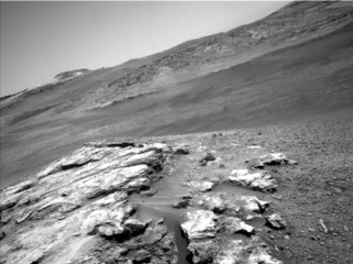 Curiosity is still perched on top of Teal Ridge to investigate a fascinating outcrop that caps the ridge. The above Navcam image shows the view off to the right of Curiosity. The ridge-capping material is visible in the foreground, and the background shows where Curiosity is going to drive to next. We are spending part of the weekend characterizing the ridge-capping material, but a majority of the weekend plan will be devoted to SAM activities to look for methane.