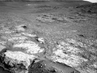 I was the SOWG Chair today, and it was a late slide sol, which means we started our day 3.5 hours later than normal in order to get some data downlinked in time for planning. The focus of this plan is to investigate the grain size, stratification, and composition of the ridge-forming outcrop shown in the above Navcam image. The plan starts with a Mastcam mosaic to investigate stratification in the slope ahead of us, followed by ChemCam on the targets "Tayside," "Badcall," and "Buckie." The plan also includes some environmental monitoring observations to characterize the amount of dust in the atmosphere. Late in the afternoon we'll use the DRT to remove dust from the "Buckie" target before imaging it with MAHLI. We also planned MAHLI observations of "Badcall." Then we'll use APXS to investigate the chemistry of both "Badcall" and "Buckie" in the evening and overnight. We'll stay at this outcrop for part of the weekend plan, so we have a few more opportunities to characterize this area and how these structures might have formed.