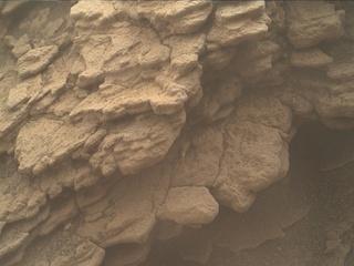 MAHLI was busy over the weekend. The data from Mars returned a trove of close-up images from the outcrop near the top of "Harlaw Rise," including the one shown here. Along with outcrop images, MAHLI took pictures of the rover wheels to check for wear and tear. Those images can be seen at this link. Although the wheels have developed some holes, the testing and modeling that have been done since early 2014 indicate that Curiosity can still travel a number of kilometers on these wheels.