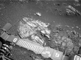 Today, Curiosity finds itself parked in front of a fascinating area of martian bedrock with clearly lighter and darker colored areas next to each other as seen in the Navcam image above. This will be a "full" contact science location and the rover will spend the next few sols examining the rocks in this immediate area just in front of the Southern Outcrop. A target on the lighter-colored bedrock was termed "Solway Firth" and it will get a ChemCam LIBS target and the full dust-removal tool treatment before APXS and MAHLI observations. The second contact science location (without the dust removal) will be "Nith" on the darker-colored bedrock.