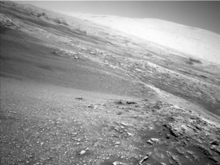 Temperatures are not today's most important record, though: Curiosity is currently tilted 25° - more than ever before, during science operations. The image above shows just how much this is. Never mind that slope…., Curiosity will get her arm out to investigate the outcrop in front of her. Since lamination and other sedimentary features are exceptionally well accessible, we planned a MAHLI dog's-eye mosaic to study all the details on this target called "East Caithness Cliff." ChemCam will target some of the layers of East Caithness Cliff for chemistry. APXS is busy on the target "Cruden Bay," which is also part of the outcrop but at a lower level than the MAHLI mosaic. Curiosity will then drive away to reach the top of the ridge. Tomorrow she should be on closer-to-horizontal ground - which hopefully comes with a first view of the top of this ridge.