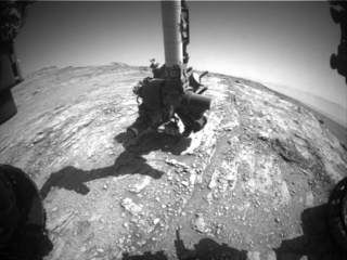 Today's science activities were planned with the hopes of drilling our next target this weekend. The scientists on today's shift were largely interested in characterizing the large block of exposed bedrock in front of the rover to derive as much information as possible before we punch through the surface and expose the rock's interior. Last evening, Curiosity brushed the dust off of the rock and made some geochemical measurements using the APXS instrument (see image). For today, we planned to acquire a multispectral image of this brushed surface in addition to two remote laser induced breakdown spectroscopy (LIBS) measurements of the bedrock's chemistry to determine whether there is spatial variability in the chemistry of this geologic unit. We also have an opportunity to acquire a large Mastcam mosaic of the large and flat geologic feature to the south of Curiosity known as the Greenheugh pediment. This enigmatic feature has been a target of interest ever since Gale crater was first being considered as a potential landing site for the Curiosity rover, and so documenting it from this new vantage point has been a high priority for the geologists on the team.