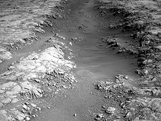 While descending from Western Butte, Curiosity has stopped to investigate a strange trough along the way. In the images from orbit, it looks like someone drew a thick straight line with a dark felt marker on the southeastern side of the butte. From the ground, it looks like a shallow ditch filled with dark sand. We don’t know what created this feature, or why it happens to be right here, so it’s worth stopping for a closer look.