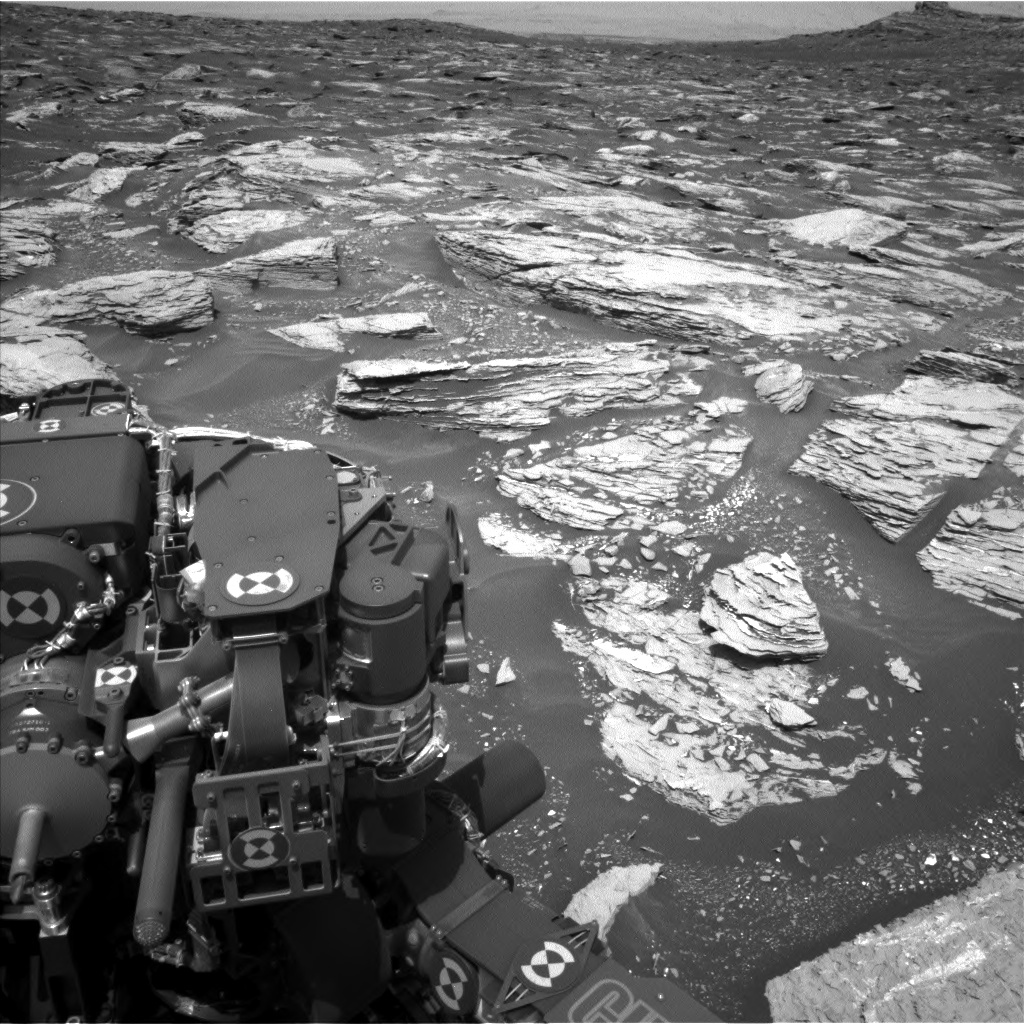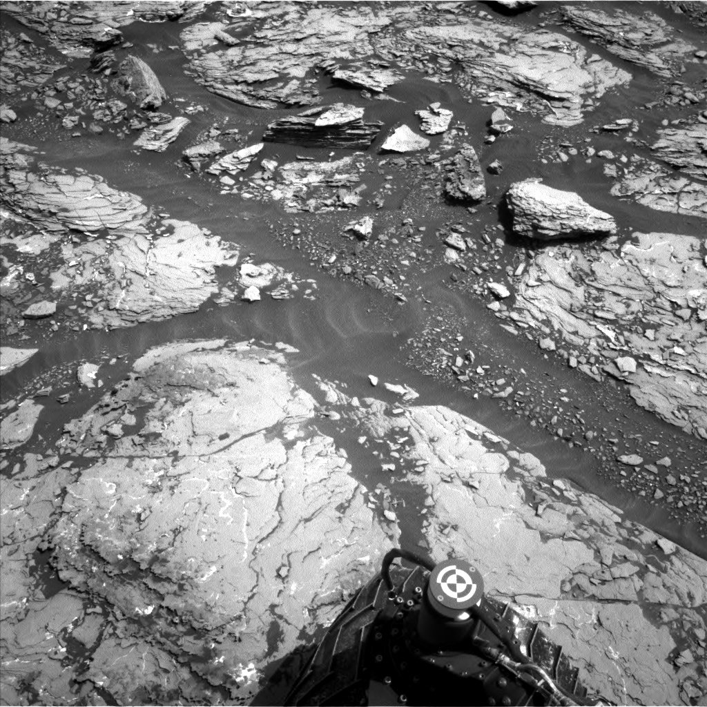 Curiosity continues to drive through an otherworldly jumble of in-place bedrock, tilted rocks, sand with small ripples, and local pebbly debris piles. Vera Rubin Ridge continues to loom larger in the rover’s forward view, although progress is somewhat slow due to the difficult terrain. Yestersol’s drive was 16 meters.
