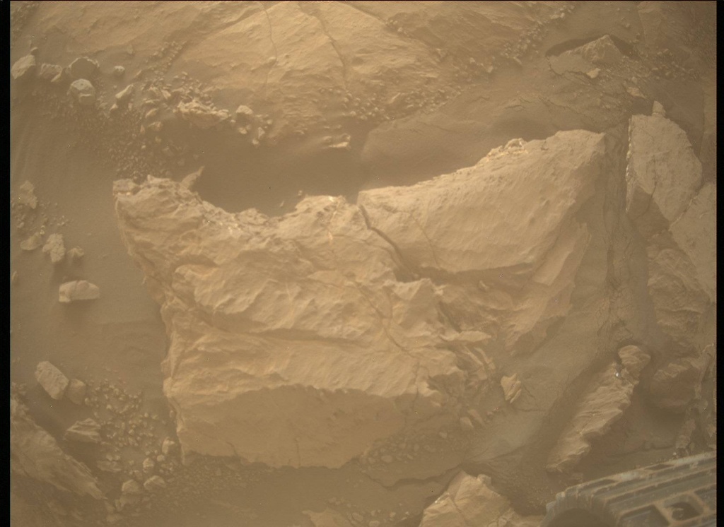 Curiosity drove a little over 16 m to the west this weekend. The rover is currently skirting around the southern edge of a small, blocky impact crater on its way north off the Vera Rubin Ridge. One of the activities we did this weekend was use MAHLI to take images of the rover wheels. We do this activity, dubbed Full MAHLI Wheel Imaging (or FMWI in NASA acronym speak), every few hundred meters to track damage to Curiosity's wheels caused by the terrain. It's important for us to take this observation in order to estimate how much farther the rover will be able to drive before the wheels become inoperable, and also to understand if the sharp edges of the broken wheels risk damaging the nearby cables. So far, we estimate we're in pretty great shape for our plans to drive a lot farther up Mt. Sharp!