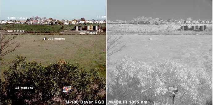 Both FFL Mastcams are color imagers. Integrated over each detector is an RGB Bayer pattern filter (GR/BG unit cell). A broadband (IR cutoff) filter through which RGB imaging will occur is included in one of the 8 filter positions within each camera's filter wheel. Both cameras also include a narrow band filter with 10^5 neutral density attenuation to image the Sun for atmospheric studies. The filters are distributed between the M-34 and M-100 to ensure each camera can address some of the compositional objectives of the investigation should the other camera fail. The science filters are imaged through the RGB filter array. For some science filters, the throughput in some pixels of the unit cell will be poorer than in other pixels, but beyond 700 nm, all three Bayer colors have nearly identical throughput (i.e., they have large IR leaks, which we are using to our advantage). The figure below shows examples taken with the Flight FFL M-100 and its Bayer filter array throughout the IR-cutoff filter and through a 1035 ± 50 nm IR science filter. In-flight calibration uses the MER Pancam spare calibration target with magnets mounted beneath the four color chips and "white" and gray surfaces to provide dust-free spots (following the approach of the Phoenix SSI team).