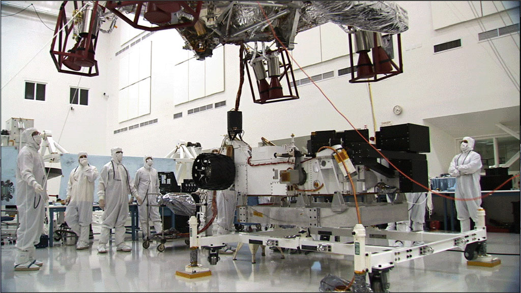 In this image, the car-size rover is in the middle of the picture with several team members surrounding it. The team members are all dressed in special head-to-toe white suits, called 'bunny suits.' One team member is holding on to a tether to guide the large insect-like descent stage down on top of the rover. The descent stage looms high in this image.