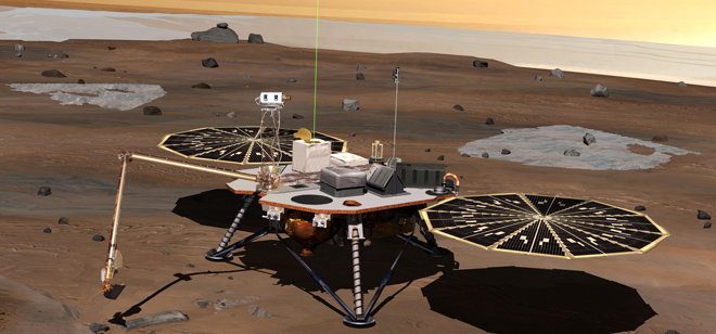 Phoenix will use a robotic arm to dig down to the expected icy layer. It will analyze scooped-up samples of the soil and ice for factors that will help scientists evaluate whether the subsurface environment at the site ever was, or may still be, a favorable habitat for microbial life. The instruments on Phoenix will also gather information to advance understanding about the history of the water in the icy layer. A weather station on the lander will conduct the first study of Martian arctic weather from ground level. The vertical green line in this illustration shows how the weather station on Phoenix will use a laser beam from a lidar instrument to monitor dust and clouds in the atmosphere. The dark "wings" to either side of the lander's main body are solar panels for providing electric power.