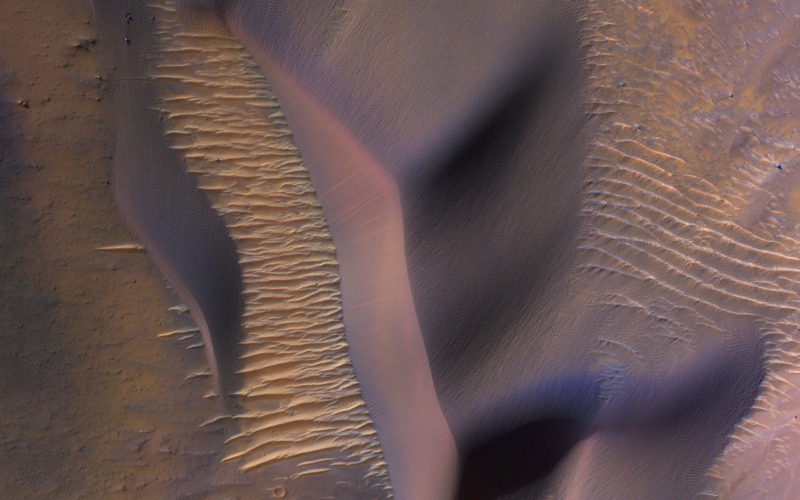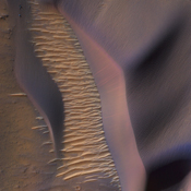 This image from NASA's Mars Reconnaissance Orbiter (MRO) shows some of these on the slopes of Nectaris Montes within Coprates Chasma. Sand dunes in Valles Marineris can be impressive in size, with steep slopes that seem to climb and descend.