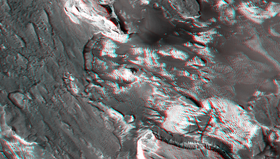 Aram Chaos is a heavily eroded impact crater that contains jumbled blocks of material disrupted when large quantities of ice or water were catastrophically removed. The light toned sediments may have been formed in a lake that once existed in the crater.