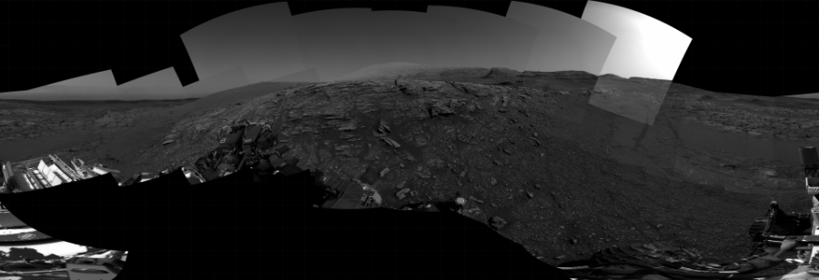 NASA's Mars rover Curiosity took 25 images in Gale Crater using its mast-mounted Right Navigation Camera (Navcam) to create this mosaic. The seam-corrected mosaic provides a 360-degree cylindrical projection panorama of the Martian surface centered at 116 degrees azimuth (measured clockwise from north). Curiosity took the images on November 13, 2020, Sol 2940 of the Mars Science Laboratory mission at drive 1584, site number 83. The local mean solar time for the image exposures was from 3 PM to 4 PM. Each Navcam image has a 45 degree field of view. CREDIT: NASA/JPL-Caltech