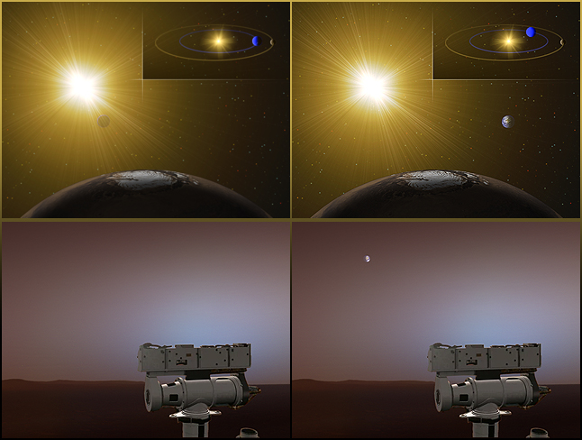 Though Earthlings will be able to get a good look at Mars during close approach, NASA's two rovers on Mars will not be able to see Earth. That's because at the moment, Earth is on the daytime side of Mars. As shown in the top half of this artist's rendering, when it's nighttime on Earth, it's daytime on Mars. After Earth passes Mars, the rovers will be able to see the sunlit side of Earth again just before dawn. The bottom half of this illustration shows what the rovers would see if they looked toward Earth.