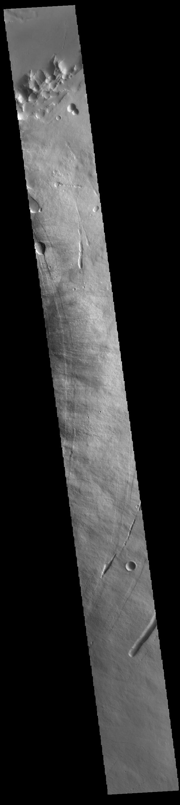 This VIS image shows part of the eastern flank of Pavonis Mons. Pavonis Mons is the central volcano of the three large Tharsis volcanoes. All three volcanoes form a line located along a tectonic bulge caused by extensional forces in the region. Pavonis Mons is the smallest of the three with a summit of only 14km (8.7 miles). The linear features in the image are concentric faults. Pavonis means peacock in Latin, making the name peacock mountain.