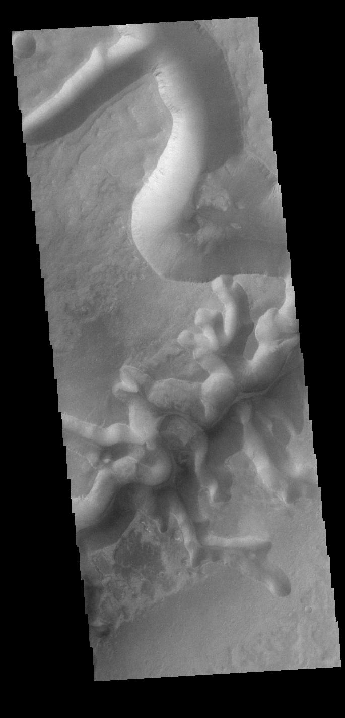 This VIS image shows one of the mega-gullies that empties into Echus Chasma. Echus Chasma is approximately 4km deep in this region, and is the source of Kasei Valles.