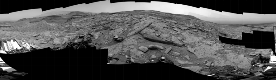NASA's Mars rover Curiosity took 31 images in Gale Crater using its mast-mounted Right Navigation Camera (Navcam) to create this mosaic. The seam-corrected mosaic provides a 360-degree cylindrical projection panorama of the Martian surface centered at 209 degrees azimuth (measured clockwise from north). Curiosity took the images on November 16, 2022, Sol 3653 of the Mars Science Laboratory mission at drive 1448, site number 98. The local mean solar time for the image exposures was 2 PM. Each Navcam image has a 45 degree field of view. CREDIT: NASA/JPL-Caltech