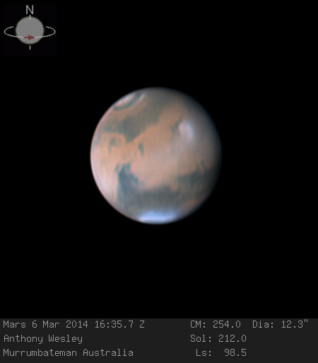 Images Mars in the Night Sky March 28, 2014 Mars, photographed on March 6, 2014, by Australian amateur astronomer Anthony Wesley using a 16-inch telescope Credits Anthony Wesley, Murrumbateman Australia ENLARGE